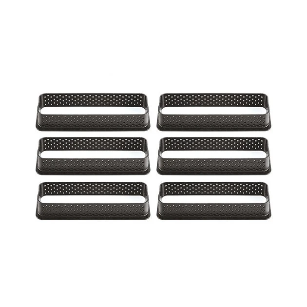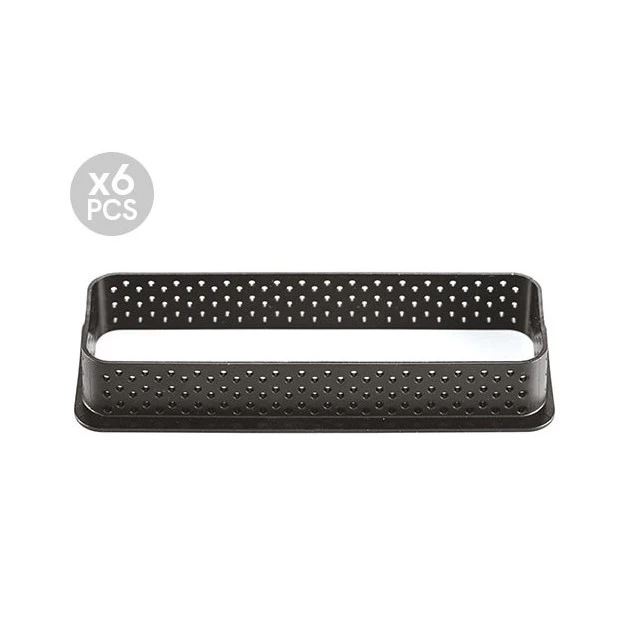 Pâtissiers et pâtissières, à vos fourneaux ! Réalisez de superbes tartelettes rectangulaires grâce au Kit Moule Rectangle Silicone 6 Tartelettes 12 cm. Ce moule rectangulaire est l’accessoire de pâtisserie qu’il vous faut puisqu’il résiste au vieillissement et sa matière anti-adhésive lui octroie une certaine souplesse ! Les grands pâtissiers sont friands de ce moule tartelette que vous avez déjà probablement vu dans une émission culinaire. Sa facilité d’utilisation, son originalité et son élégance en font un accessoire redoutable pour proposer des desserts très visuels. Alors, procurez-vous ce Kit Pâtisserie comprenant un moule silicone de 6 empreintes de 26 ml et 6 cadres rectangulaires perforés de 12 cm ! Les cadres rectangulaires ont l’avantage de posséder des petits trous qui libèrent et diffusent la chaleur sur votre réalisation, ainsi, une cuisson homogène est permise.